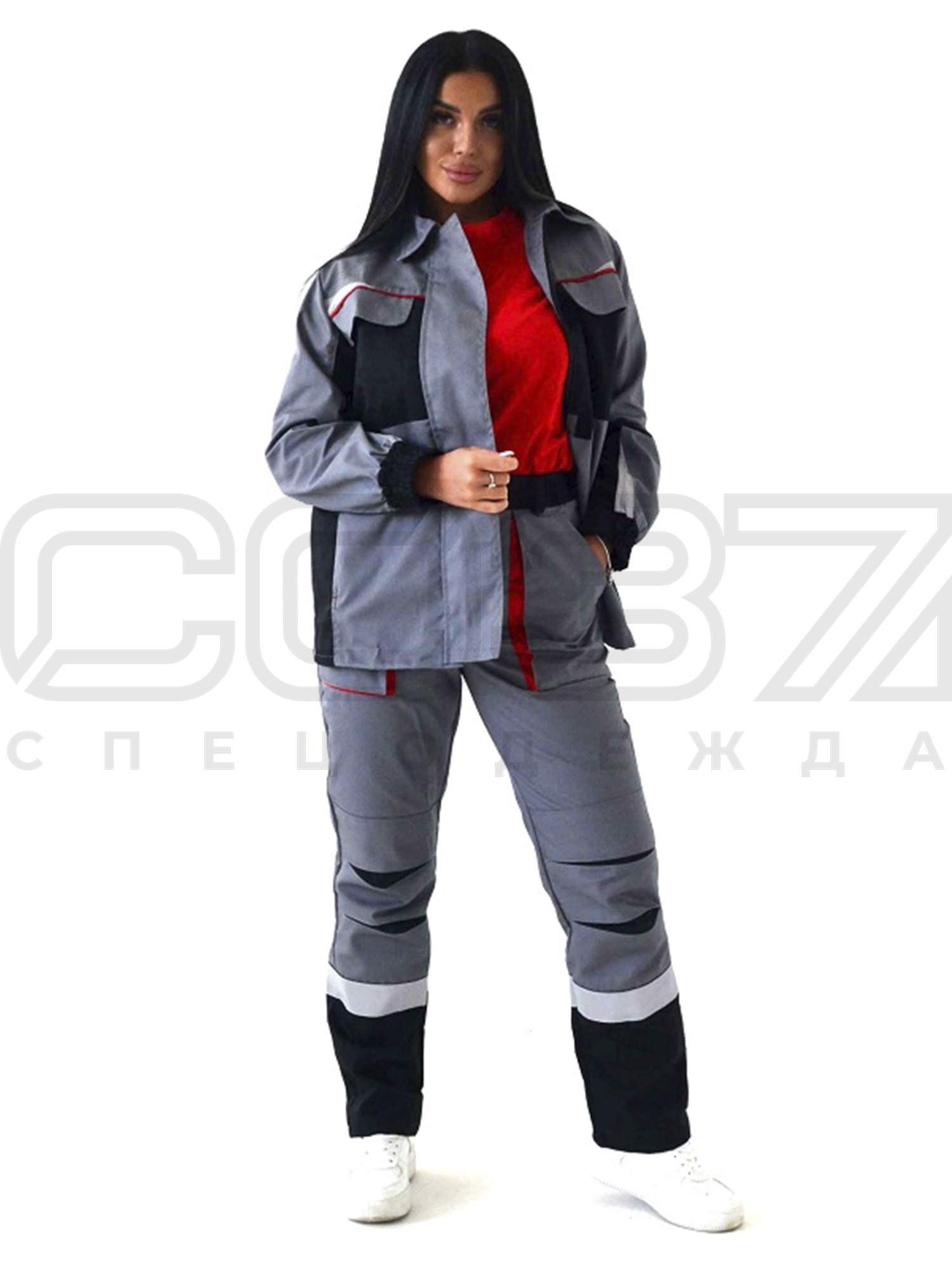 Костюм рабочий женский "Кейп" с СОП цв.серый/чёрный/красный тк.смесовая (куртка+брюки) в Смоленске